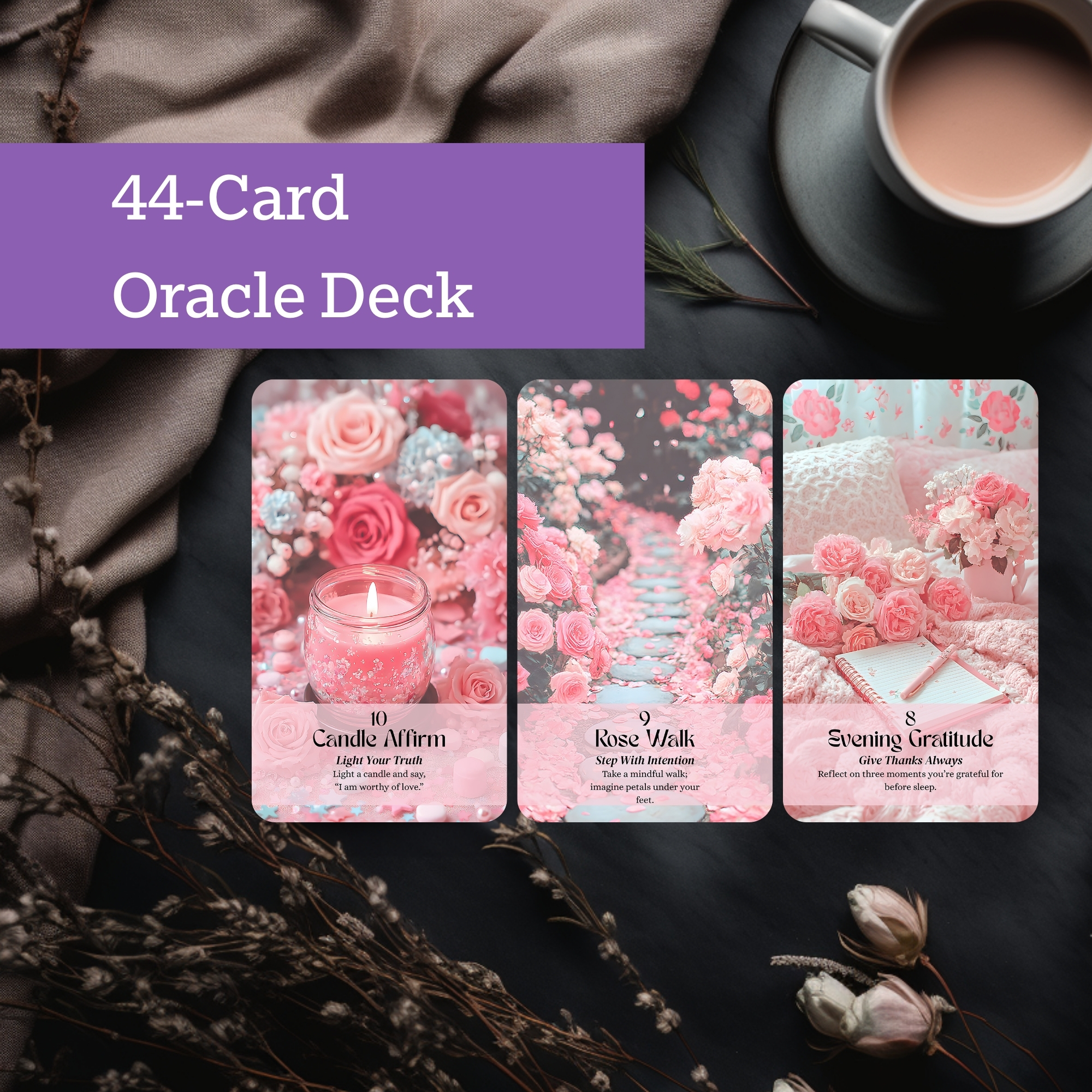 A sacred self-love journey rooted in rose magick & feminine ritual. Rose Rituals is a 44-card oracle deck designed to reconnect you with softness, sovereignty, and soul. Inspired by the healing symbolism of the rose, each card is a ritual in itself — an invitation to pause, listen, and return to your heart. This deck is divided into four powerful themes: Petal Practices — gentle daily rituals for grounding and self-care Thorn Medicine — shadow work and boundary-setting with love Bloom Wisdom — affirmations and soul messages for clarity and grace Rose Essences — archetypes of the rose for deeper energetic insight Whether used as a morning pull, moon ritual companion, or journal prompt, these cards offer a floral altar for your inner blooming.